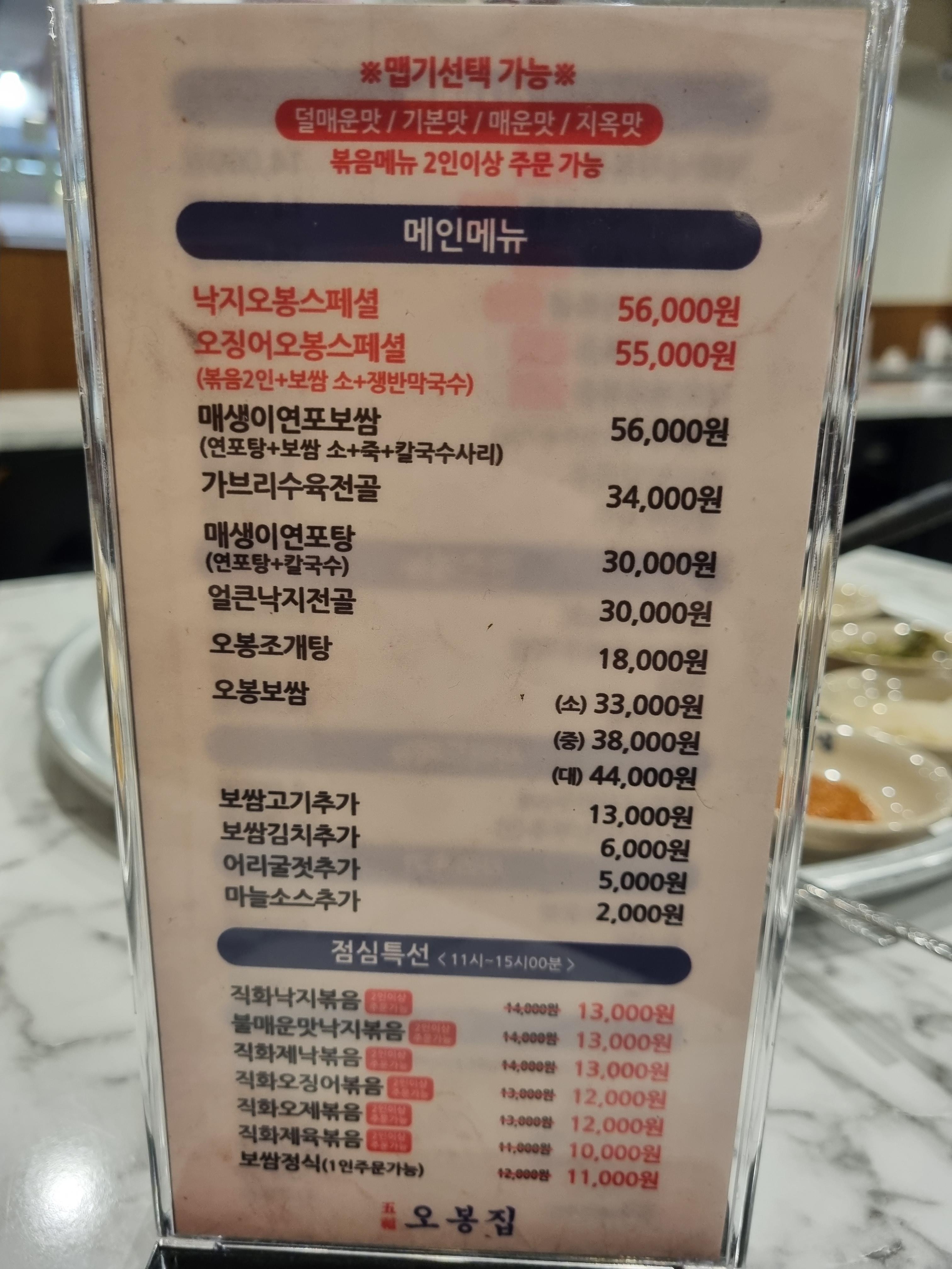 메뉴판 처음 갔을 때 얼큰낙지전골과 보쌈정식1인을 시켰습니다.