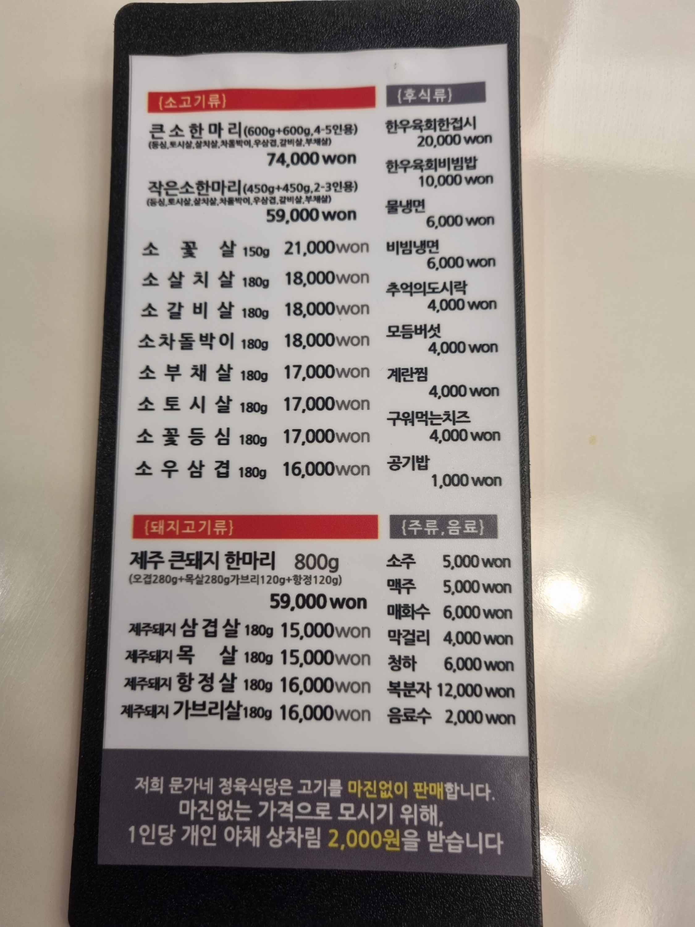 이곳은 마진없이 고기를 판매하여, 1인당 개인 야채 상차림비 2천원을 받습니다.